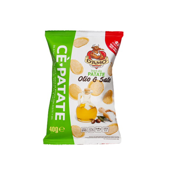 Simple, clean, and full of flavor – D’Amo Patato Chips Oil & Salt are made with 60% real dehydrated potatoes and finished with extra virgin olive oil and a touch of sea salt. No additives, no palm oil, no allergens – just real ingredients and that authentic Italian crunch.