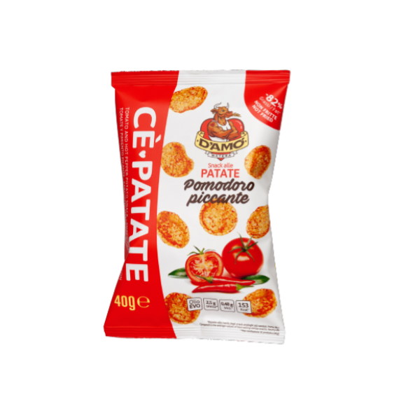 Turn up the heat with D’Amo Patato Chips Tomato Spicy bold, crispy chips made from 60% real dehydrated potatoes and a zesty blend of tomato and chili. A light snack with full flavor, crafted with extra virgin olive oil and no palm oil or allergens.