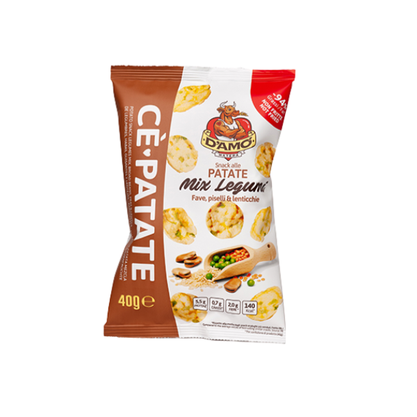 Snack smarter with D’Amo Patato Chips Mix Legumes a light and crunchy Italian chip made from real dehydrated potatoes and a mix of legumes including broad beans, peas, and lentils. Baked to perfection, not fried, and completely free of palm oil, saturated fats, and allergens.